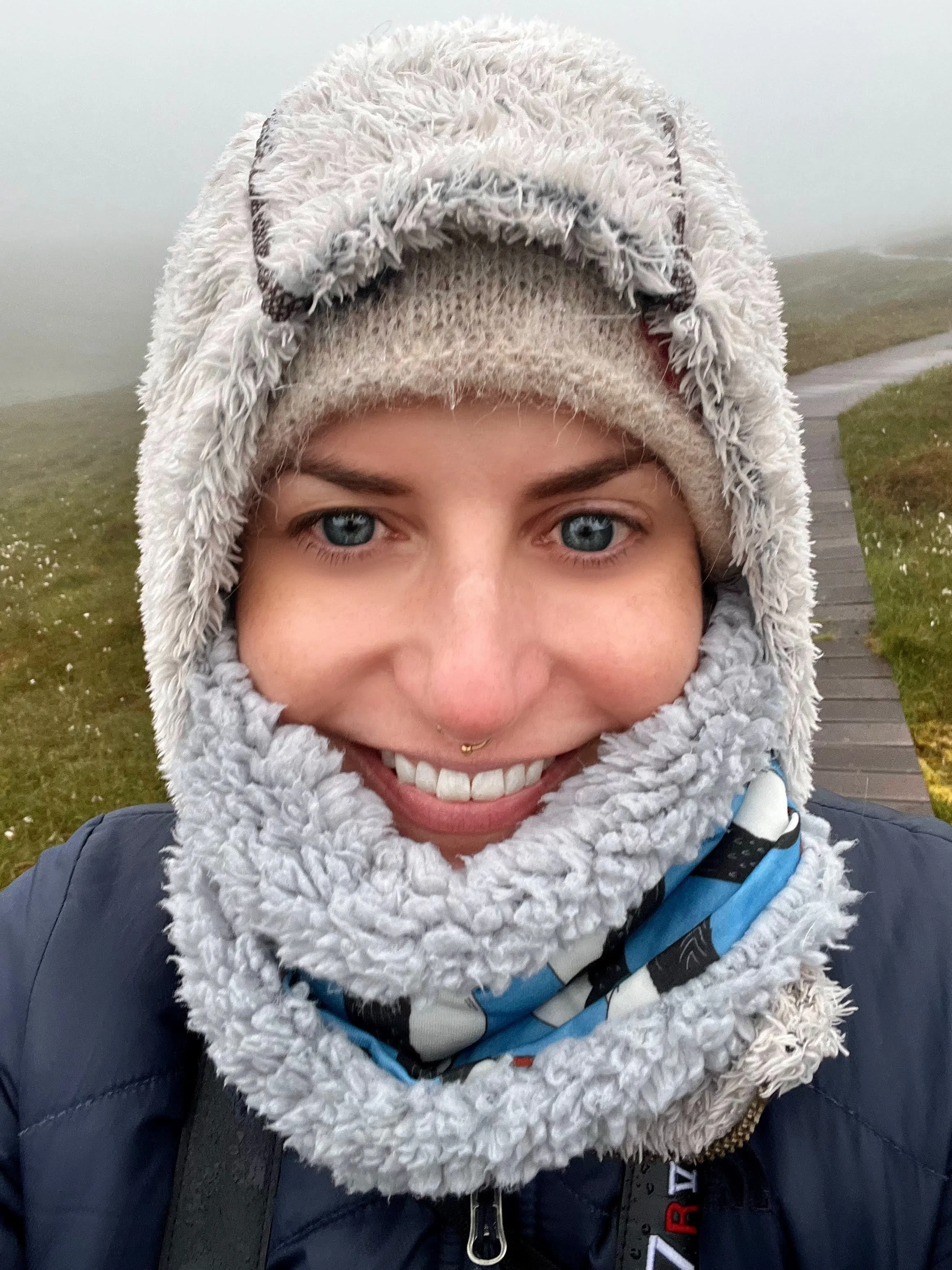 Sandy Coburn poses in faux fur rabbit ears, camera by her side bundled up for a wintery winter photo shoot on a snowy road in Norway. Photo by Cora Opsahl.