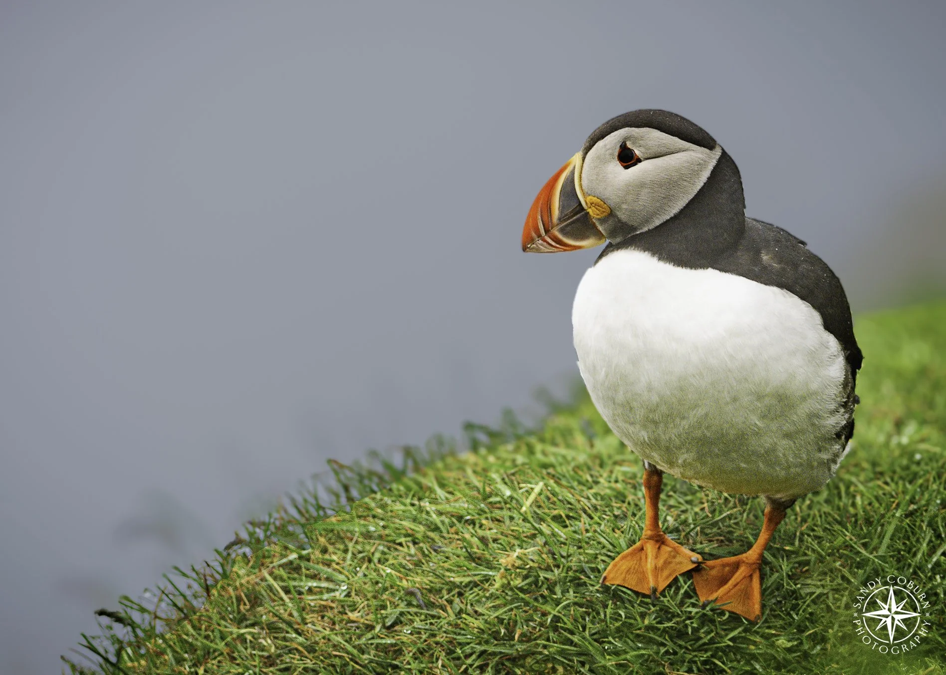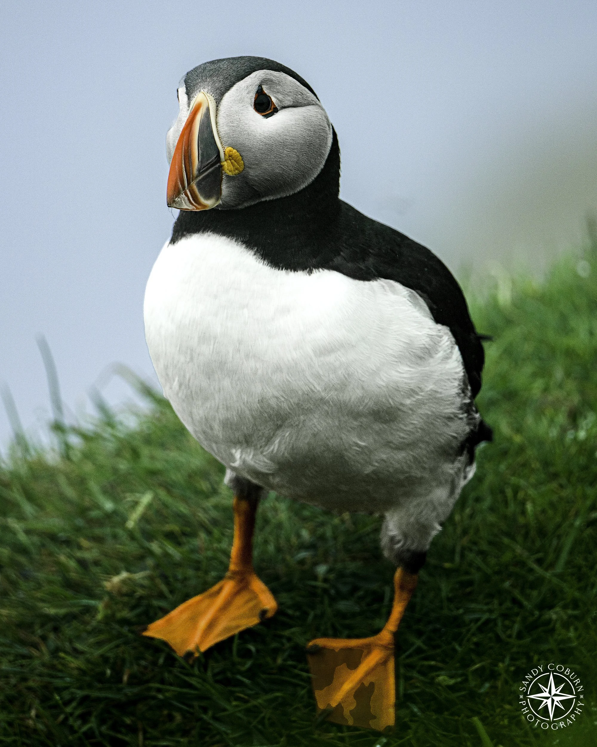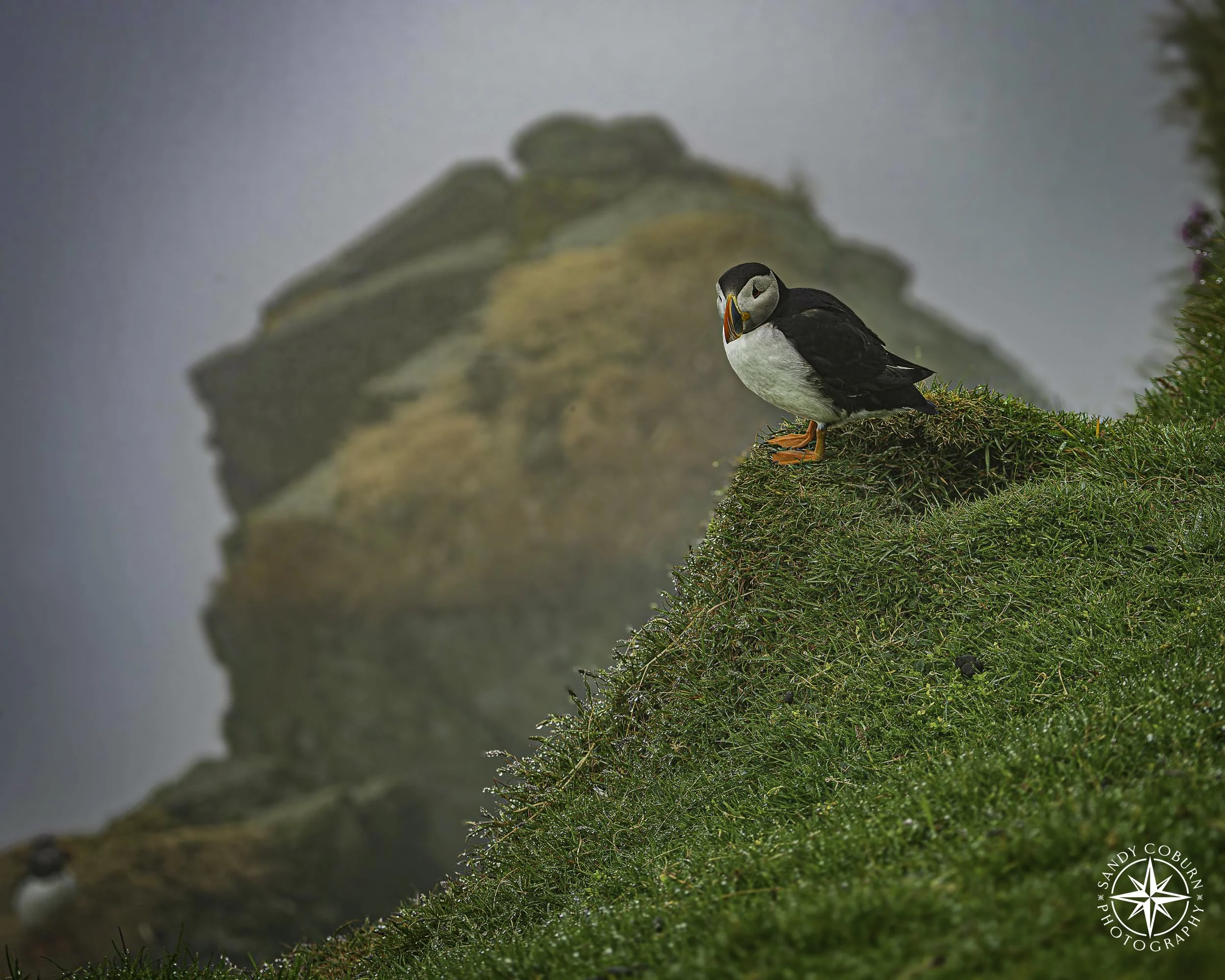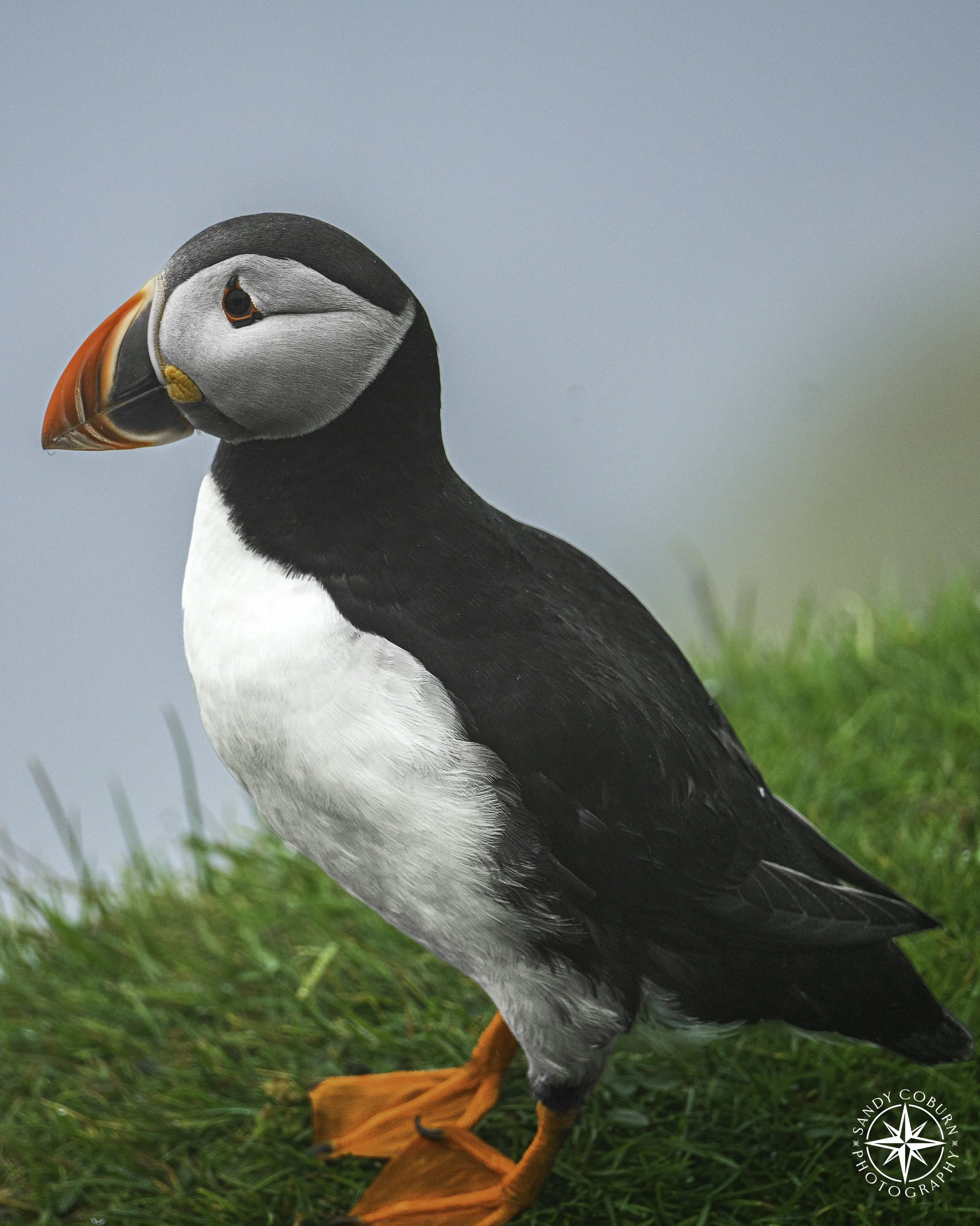 Amid the chill and rising wind, this puffin stands tall—its bright feet and flame-orange beak glowing against the storm. A study in poise, presence, and elemental contrast.