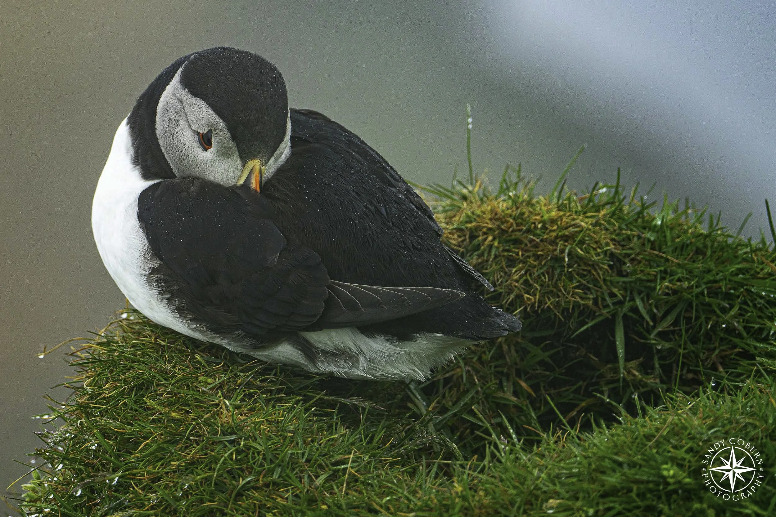 Perched at the nest’s edge, this puffin folds into a moment of instinct and care—beak tucked, gaze turned inward toward the earth it calls home.