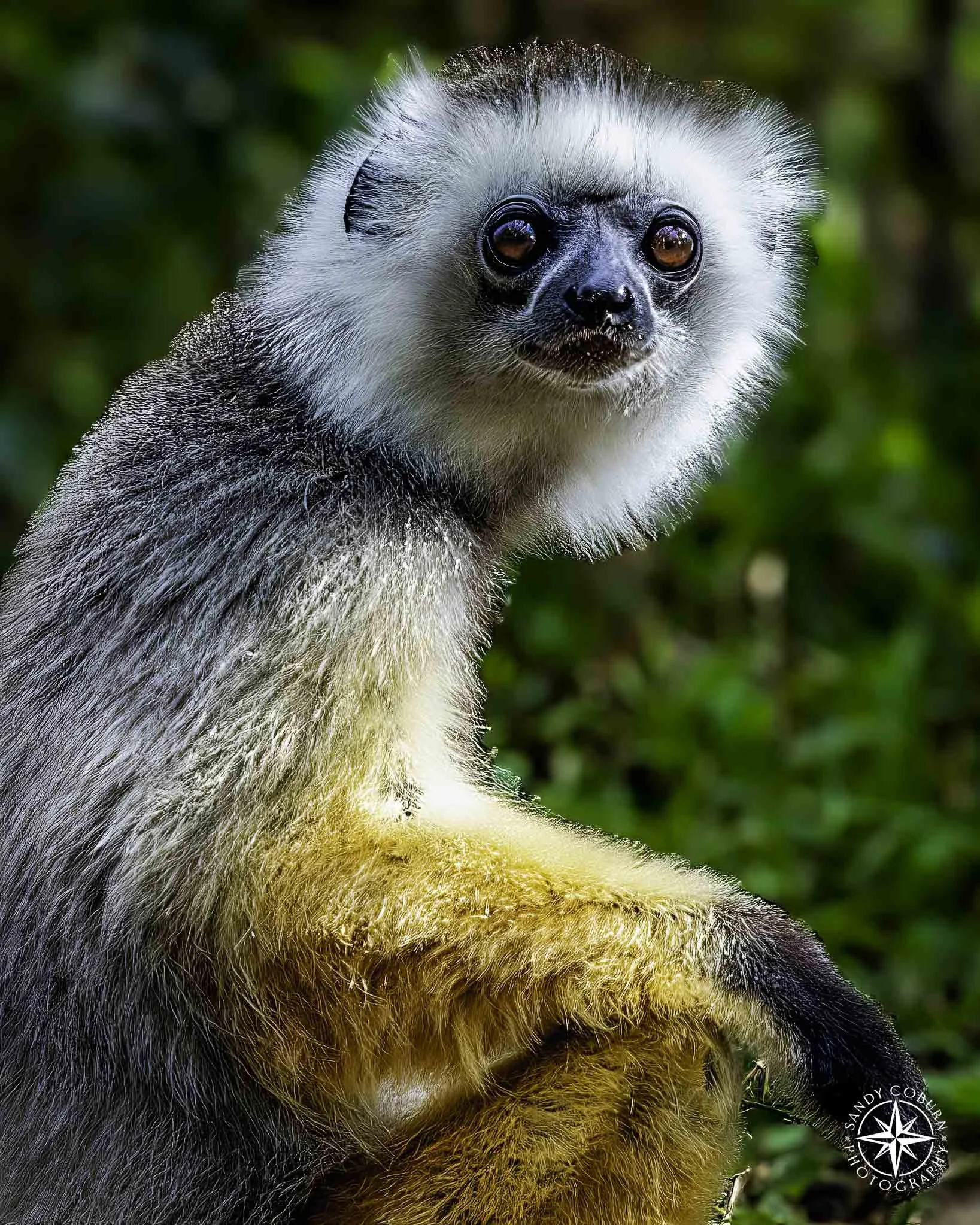 Perched in foliage, this golden sifaka holds a steady gaze, alert yet serene. With fur the color of saffron and a crown of white, they watch over the forest with quiet vigilance—both guardian and ghost of Madagascar’s vanishing wilds.