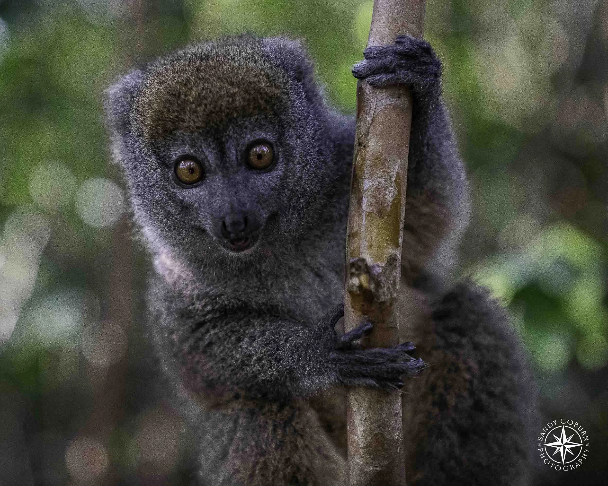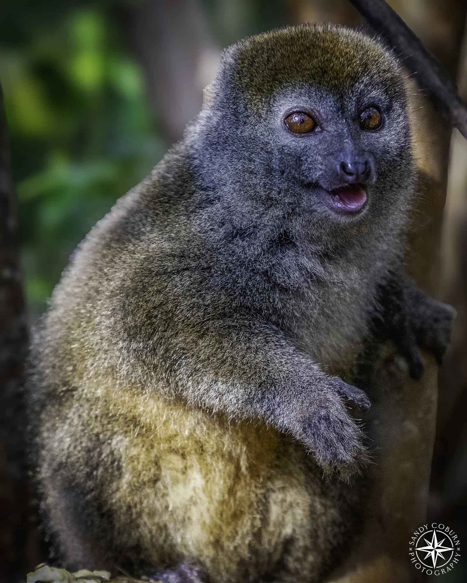 Perched gently in the trees, this bamboo lemur offers a rare and open expression—ears tucked, eyes forward, mouth slightly ajar in what feels like a moment of connection.