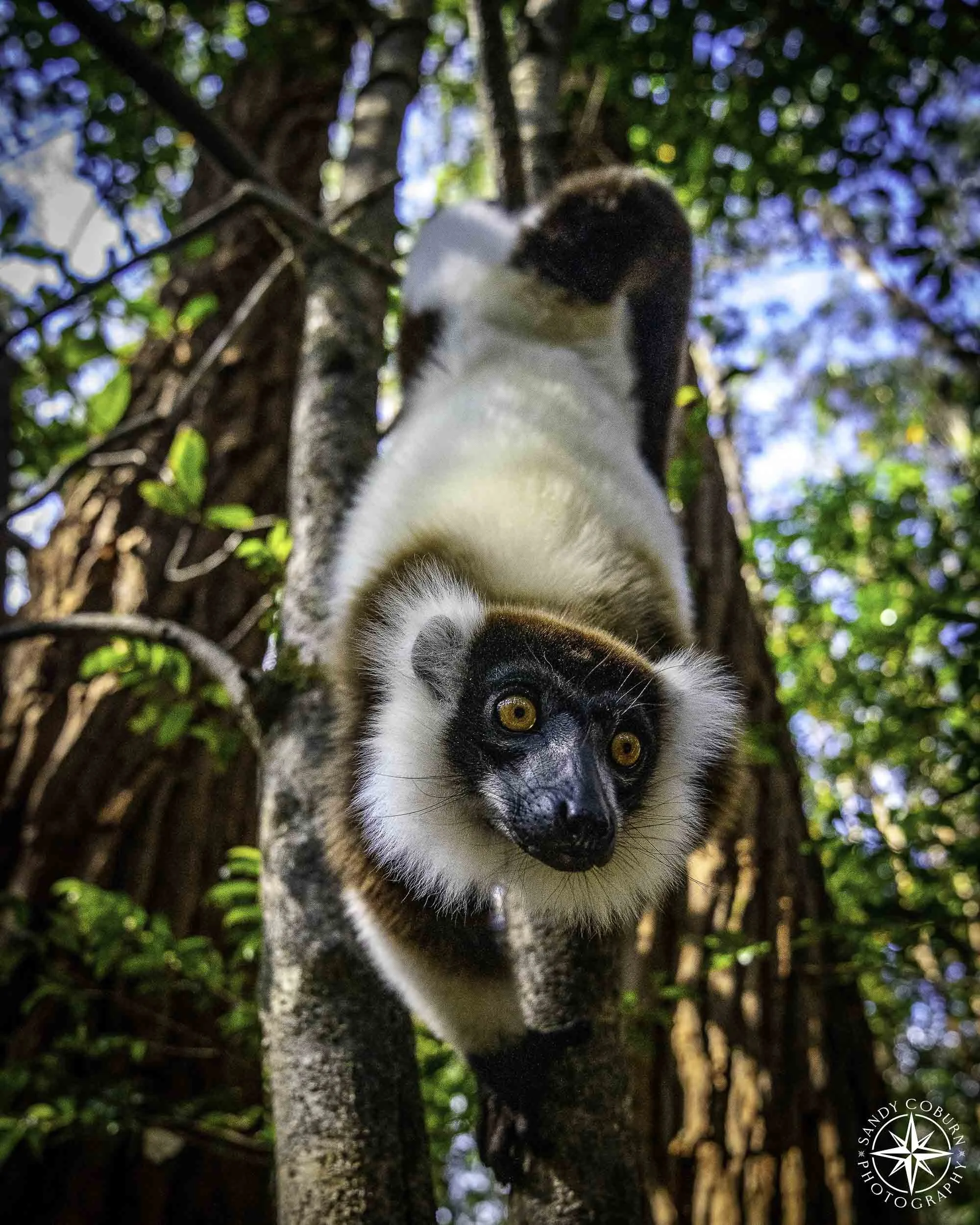 Suspended in a perfect curve, this lemur dangles from a branch with effortless grace. Inverted yet serene, it embodies the fluid elegance and adaptability that define life in the canopy.