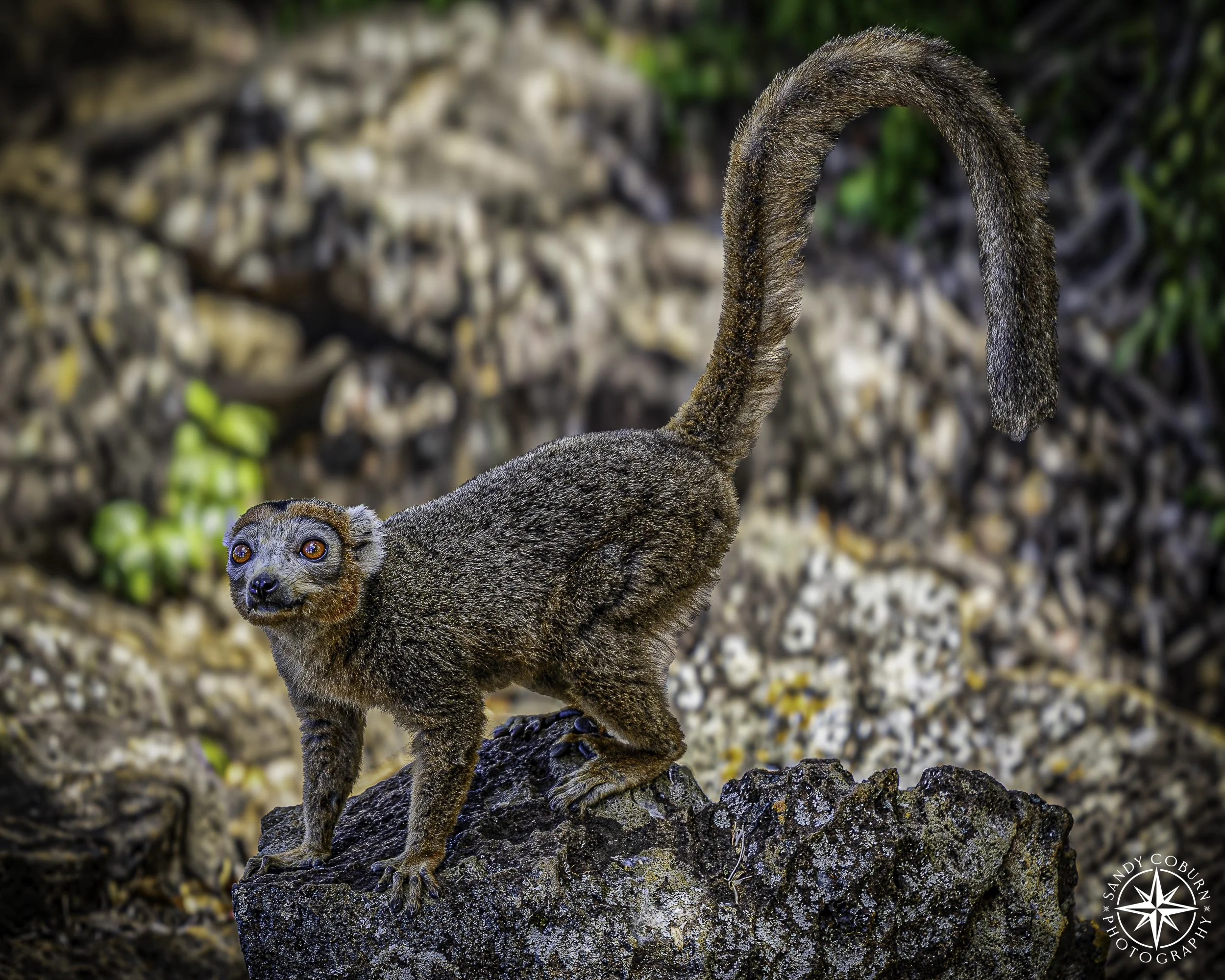 Tail curled high and body angled toward the unknown, this crowned lemur pauses at the threshold of motion. Perched on a rocky outcrop, it surveys the forest with keen eyes and cautious grace — a fleeting moment of balance between stillness and speed.