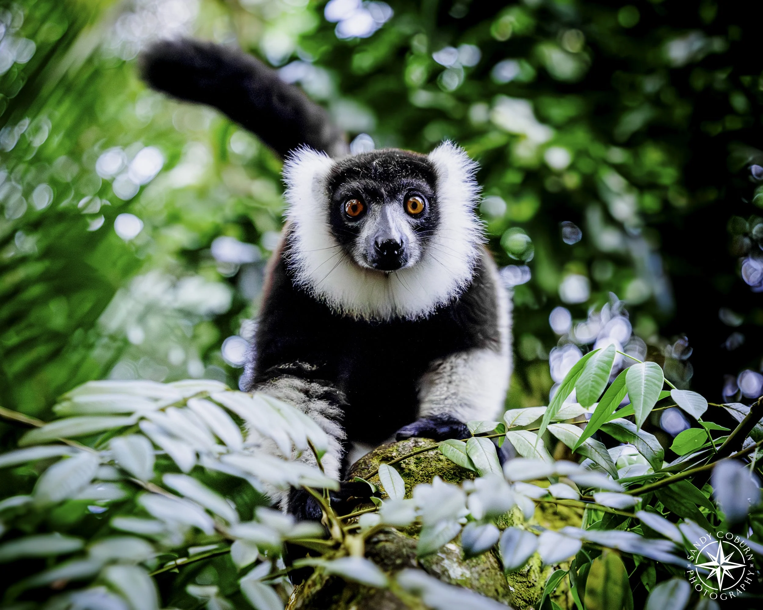 Caught between ground and canopy, this black-and-white ruffed lemur hovers in a moment of stillness—red eyes wide, limbs taut with intention. Every line of its body speaks of motion, memory, and the wild, rhythmic pulse of the forest.