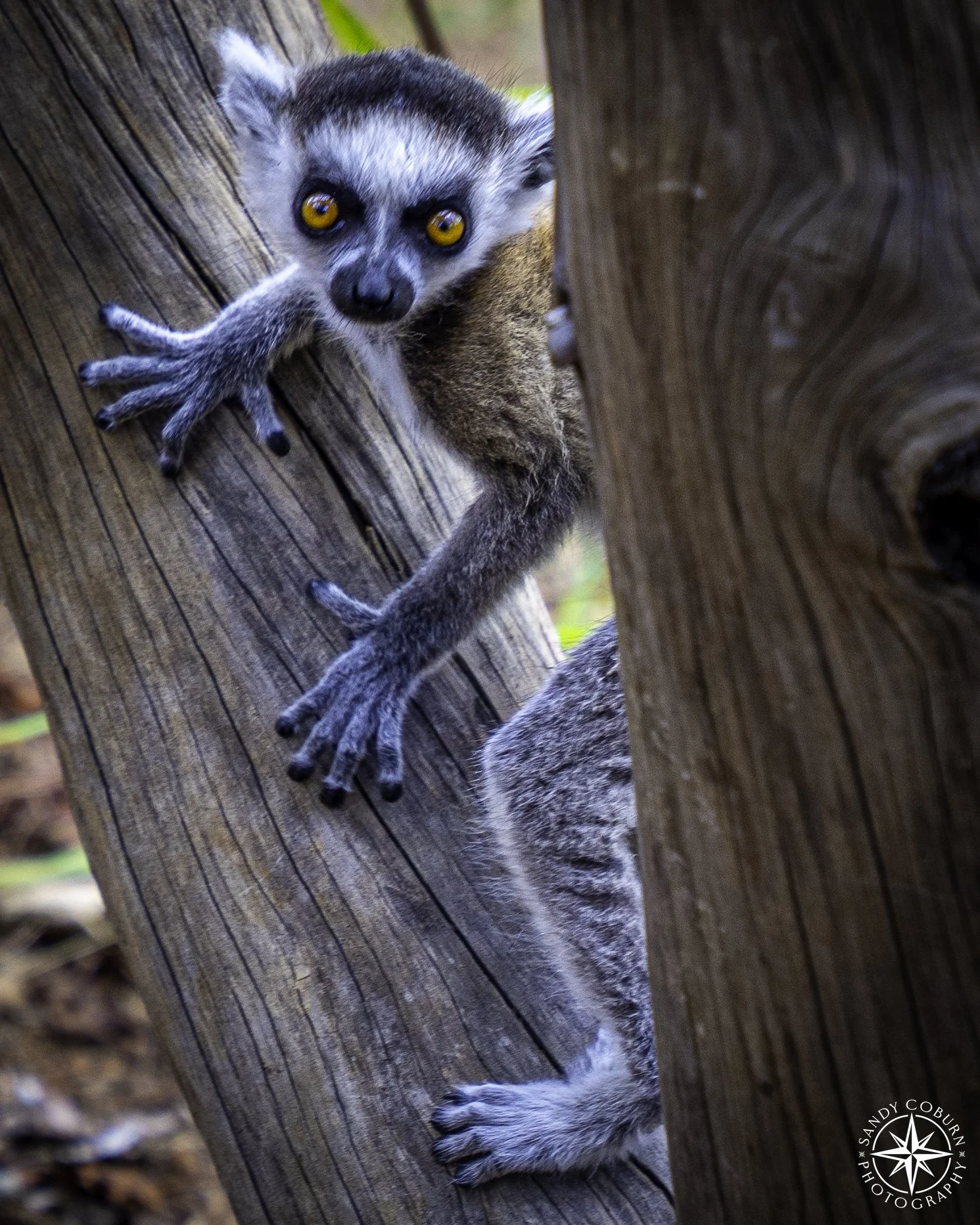 A young ring-tailed lemur clings to a sun-warmed branch, fingers splayed in fierce focus. Every climb is a new lesson, every grip a test of balance and instinct. With gaze lifted, this juvenile learns the forest’s vertical rhythm—one leap at a time.