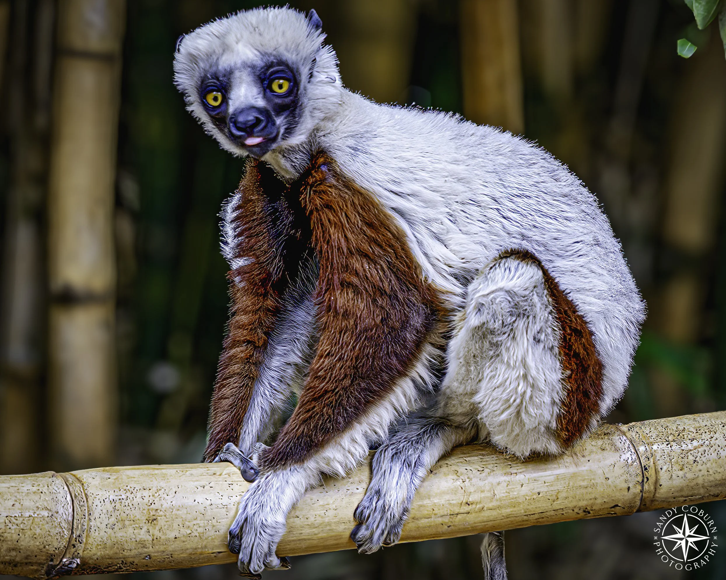 A Coquerel’s sifaka perches on bamboo, its tongue caught mid-motion as if in quiet deliberation. The gaze is steady, the moment unscripted—a rare, expressive pause from one of Madagascar’s most endangered primates.