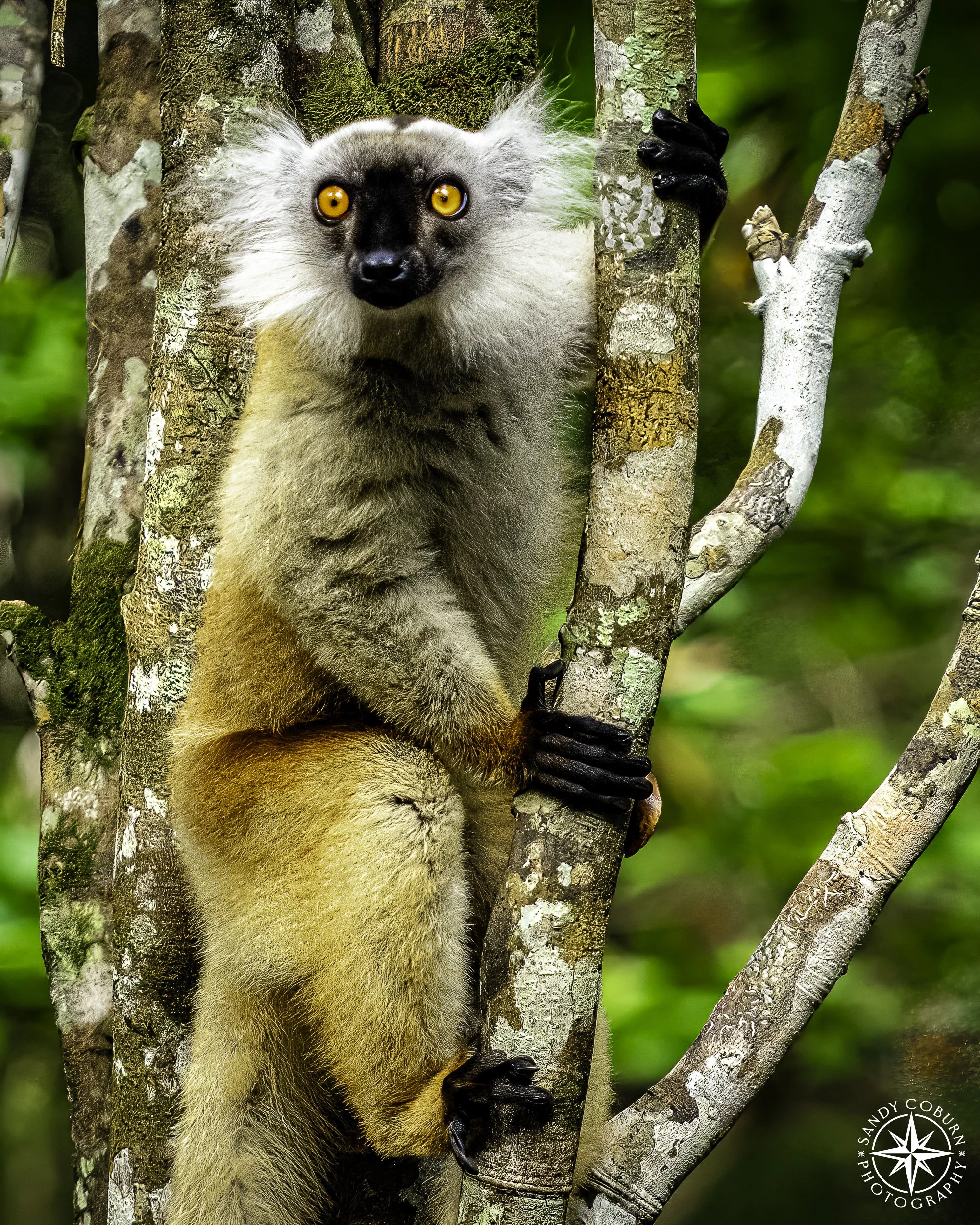With its body in profile and eyes meeting the camera head-on, this golden sifaka strikes a pose of quiet confidence. The soft, pale crown framing their face glows gently in the filtered forest light—an elegant moment of calm in the canopy.