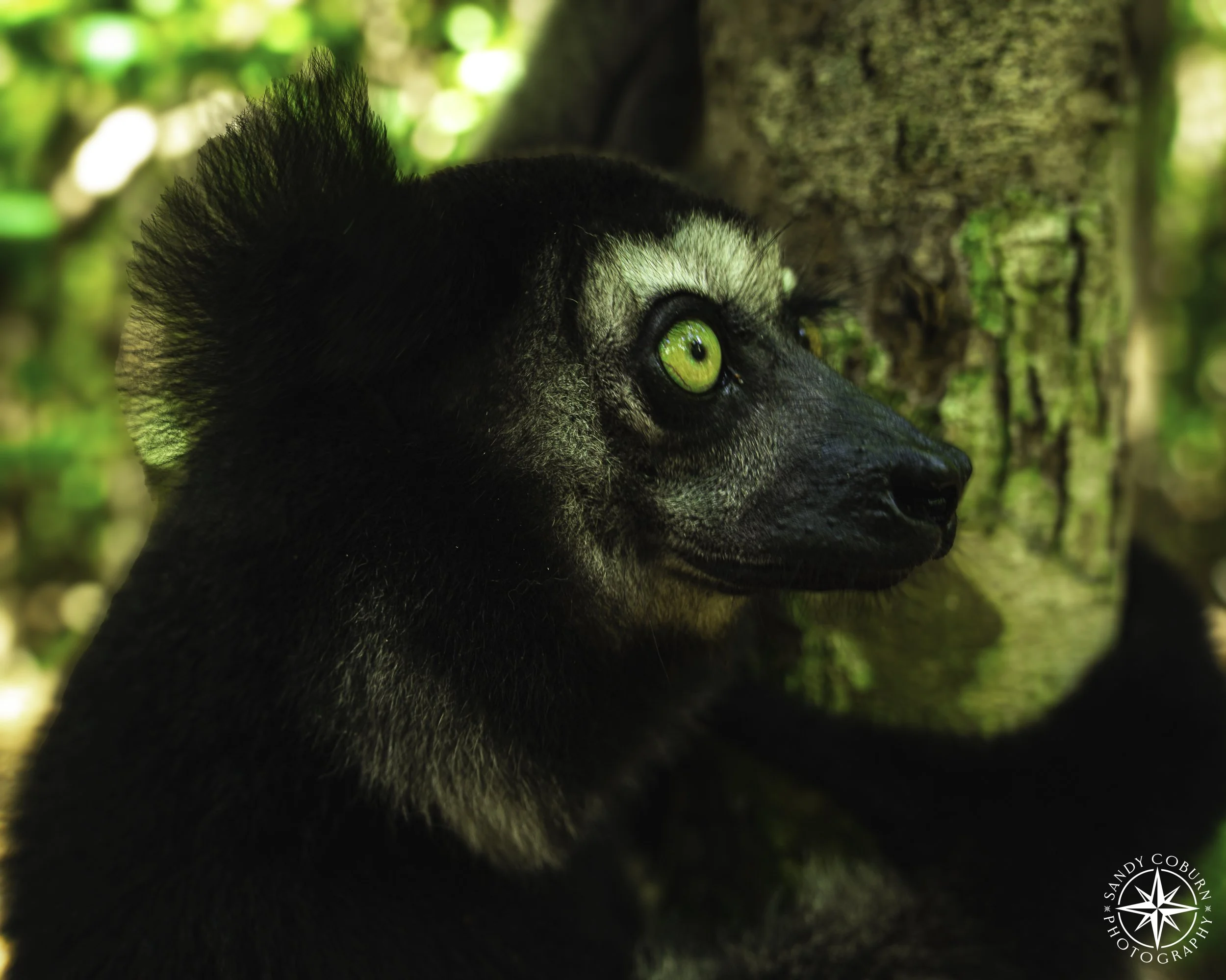 Partially hidden in the rainforest canopy, this Indri (Indri indri) gazes out with luminous green eyes. Known as the “ghost of the forest” for their haunting, far-reaching songs, these critically endangered lemurs are heard long before they are seen—voices echoing across the treetops like ancestral memory.