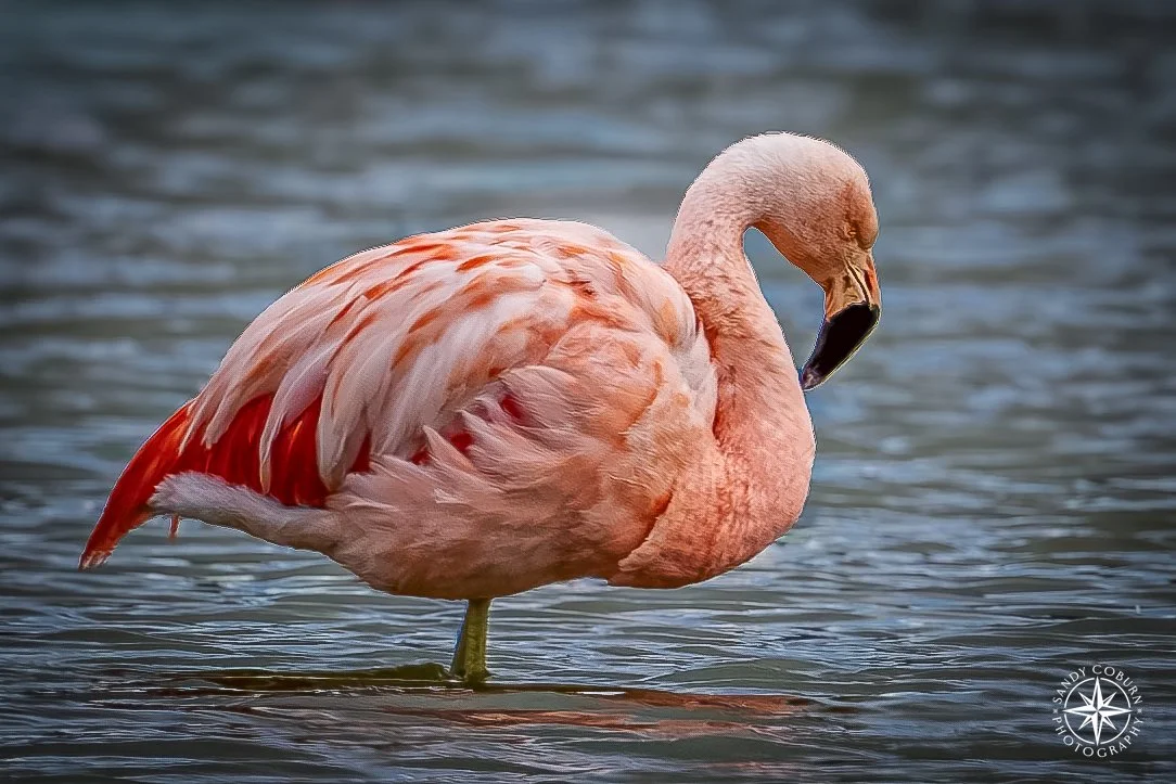 A flamingo stands poised in the shallows, its pink form luminous against the cool light.