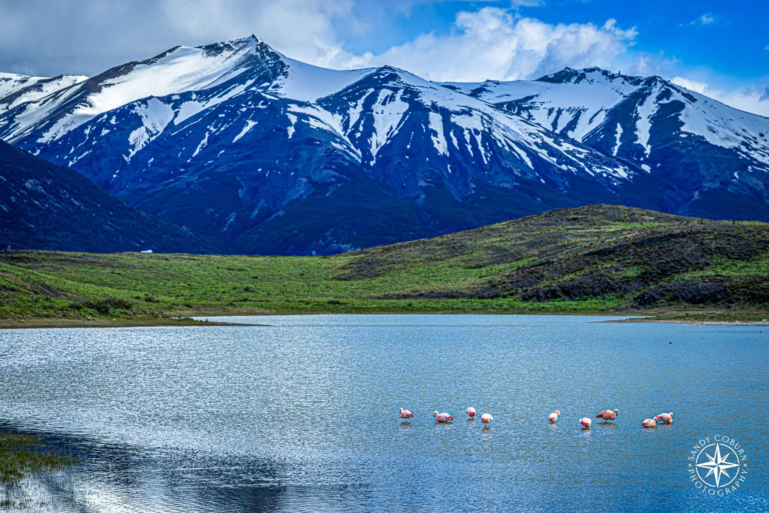 A flock of flamingos gathers on a blue lake, their pink forms dots on the calm water. Behind them, a snow-capped mountain rises in quiet contrast.