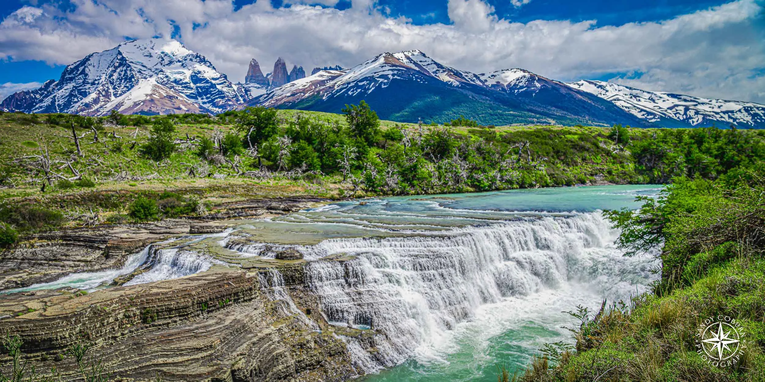 A turquoise waterfall spills over sun-washed stone, with Patagonia’s iconic towers rising beyond in quiet command. Beneath a sky brushed with cloud, this landscape unfolds in elemental contrast—where water moves, and mountains remain.