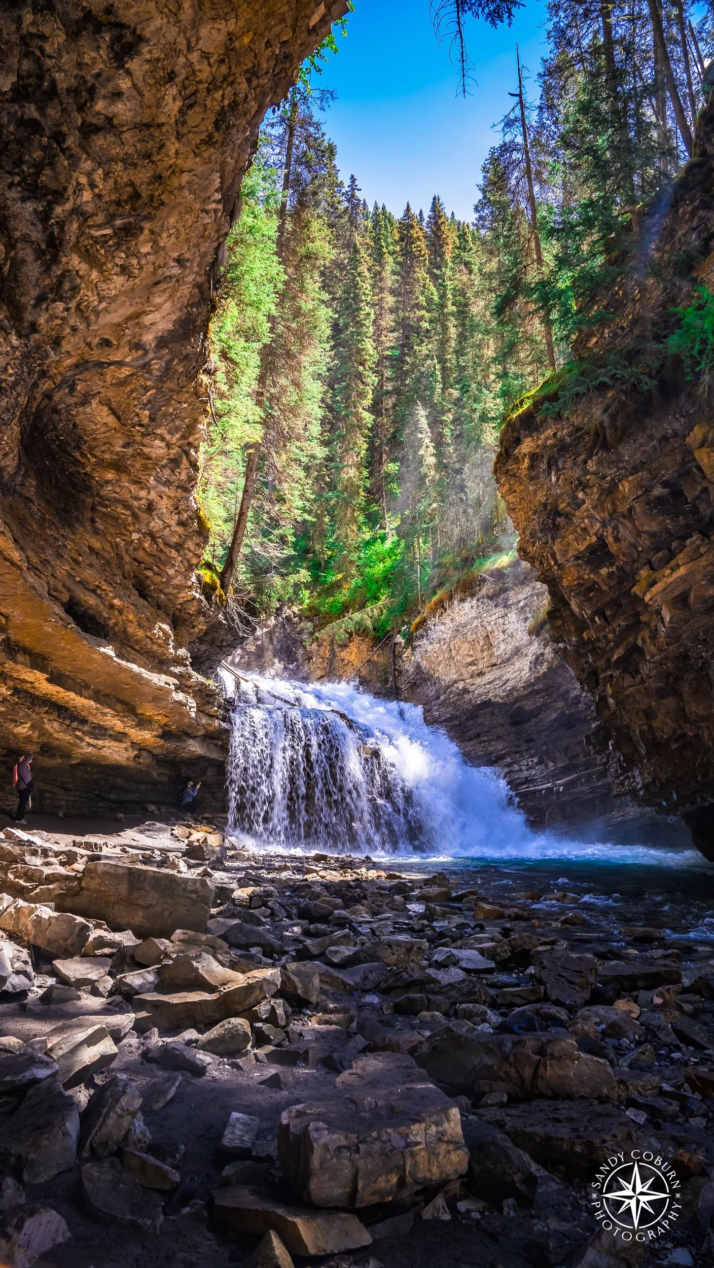 Tucked within Johnston Canyon, a waterfall arcs into view, framed by a sweep of light. A figure with a camera stands in reverence, revealing the hidden magnitude of this place. Captured from the Ink Blots Trail, this award-winning image honors nature’s grandeur.