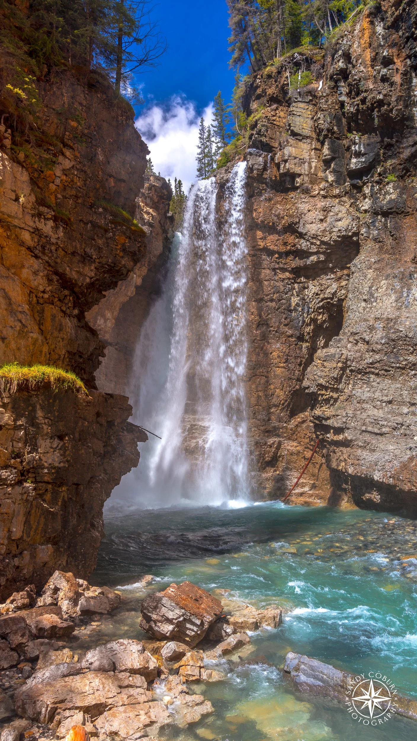 A towering waterfall cascades through rust-colored stone into a luminous pool below, where glacial silt turns the water an impossible shade of turquoise. From deep within Banff’s Ink Blots Trail, this hidden force reveals nature’s quiet alchemy—stone, meltwater, and time in constant transformation.