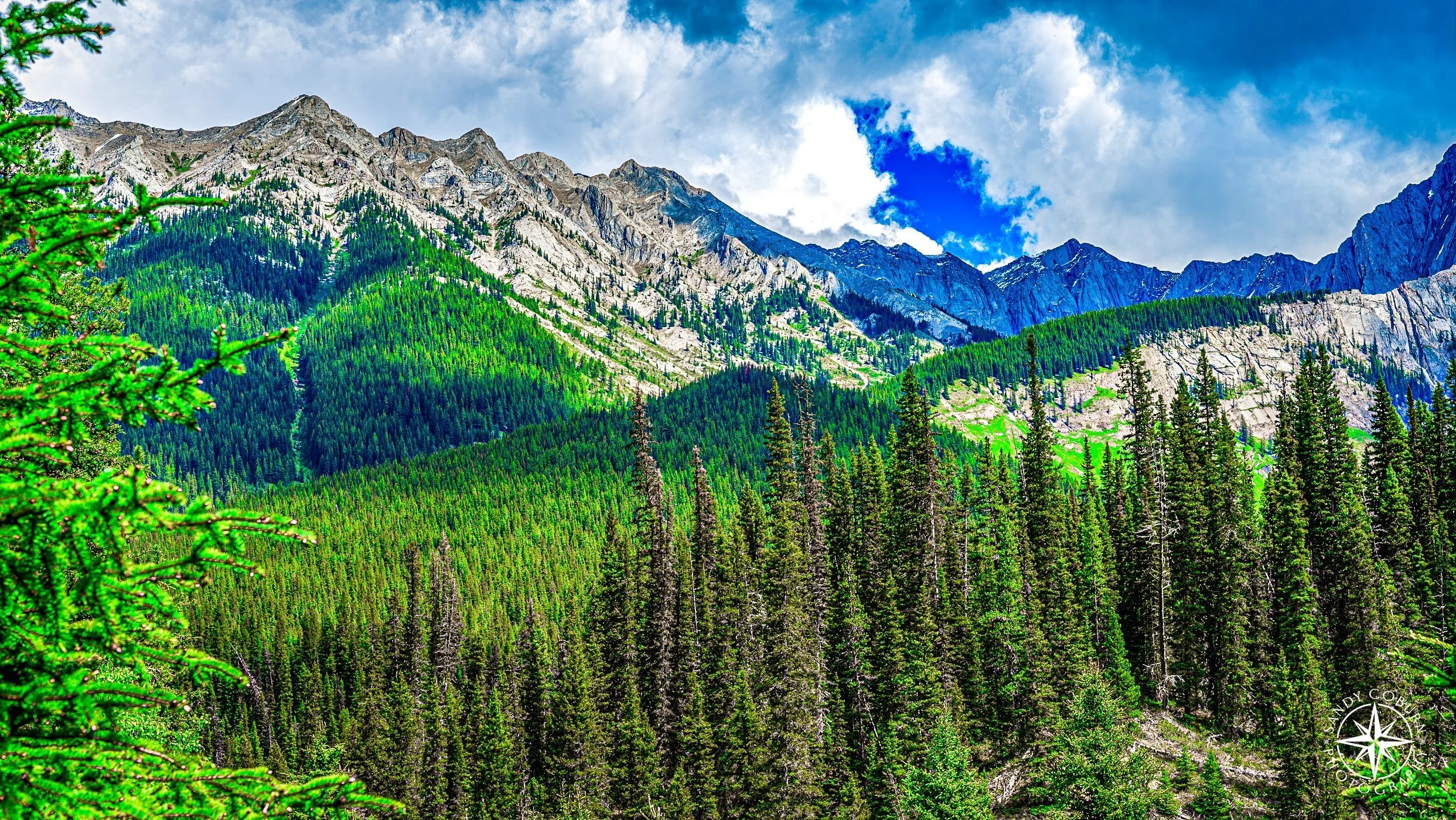 In early summer, a meadow of emerald pines opens in quiet strength before Banff’s snow-laced peaks. The stillness between seasons lingers here.