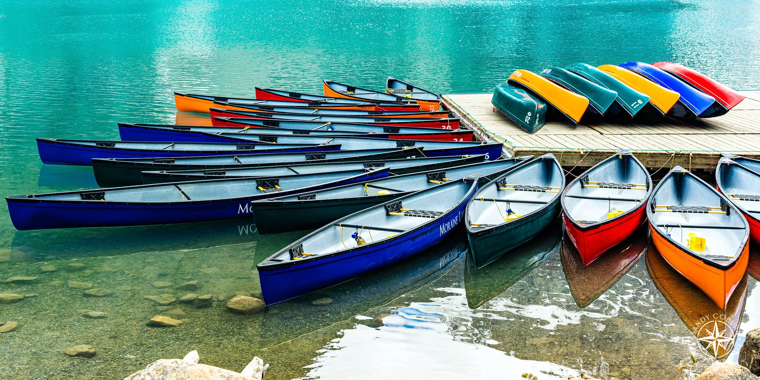 Arranged like a burst of wildflowers, a rainbow of canoes fans from the dock at Lake Moraine. Their vivid colors mirror the landscape’s natural palette—fiery reds, sunflower yellows, cool blues—floating atop waters so teal they seem painted into place.