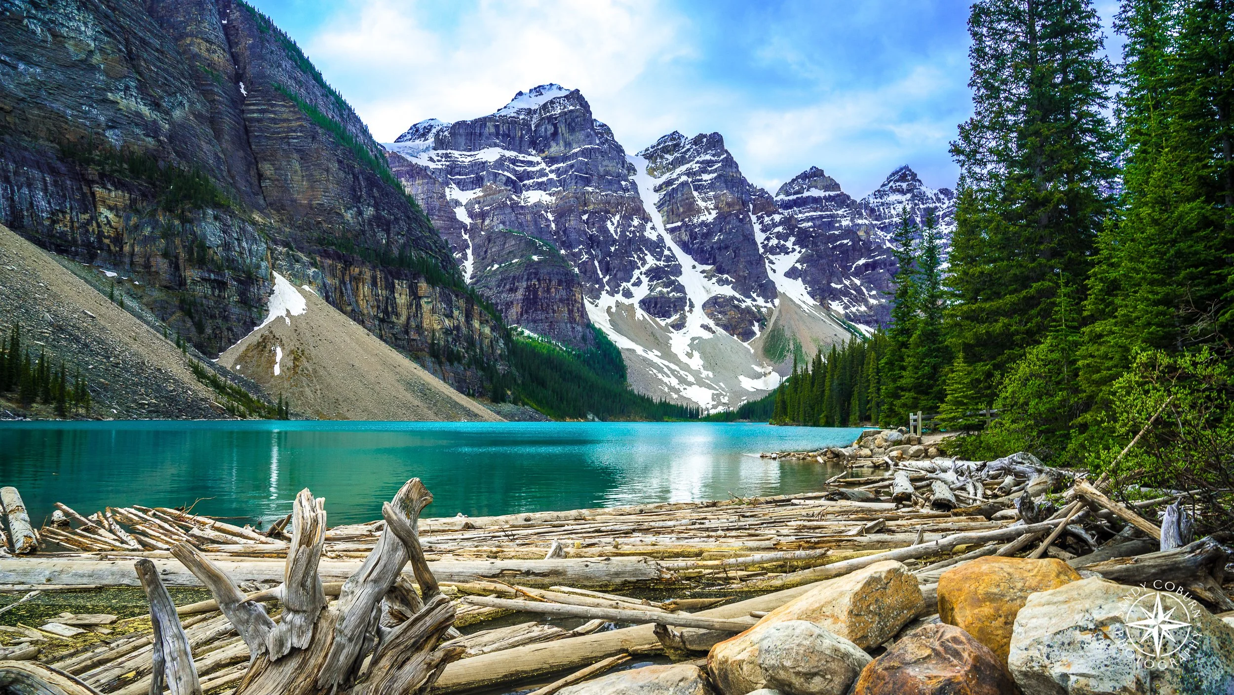 Four towering peaks rise like ancient sentinels above the dark blue-green waters of Lake Moraine. Snow clings to their granite flanks, tumbling in frozen ribbons, while driftwood gathers below—nature’s quiet offerings at the feet of the mountains.