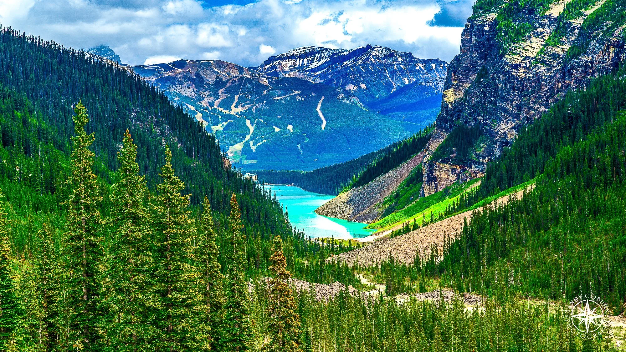 From atop a glacier, Lake Louise shimmers below in glowing teal, cradled by emerald slopes and guarded by snow-capped peaks. The valley opens like parted curtains, revealing a scene that feels both intimate and immense—a sanctuary shaped by time, water, and stone. So bright it seems lit from within, the lake gleams like a jewel set into the heart of the mountains.