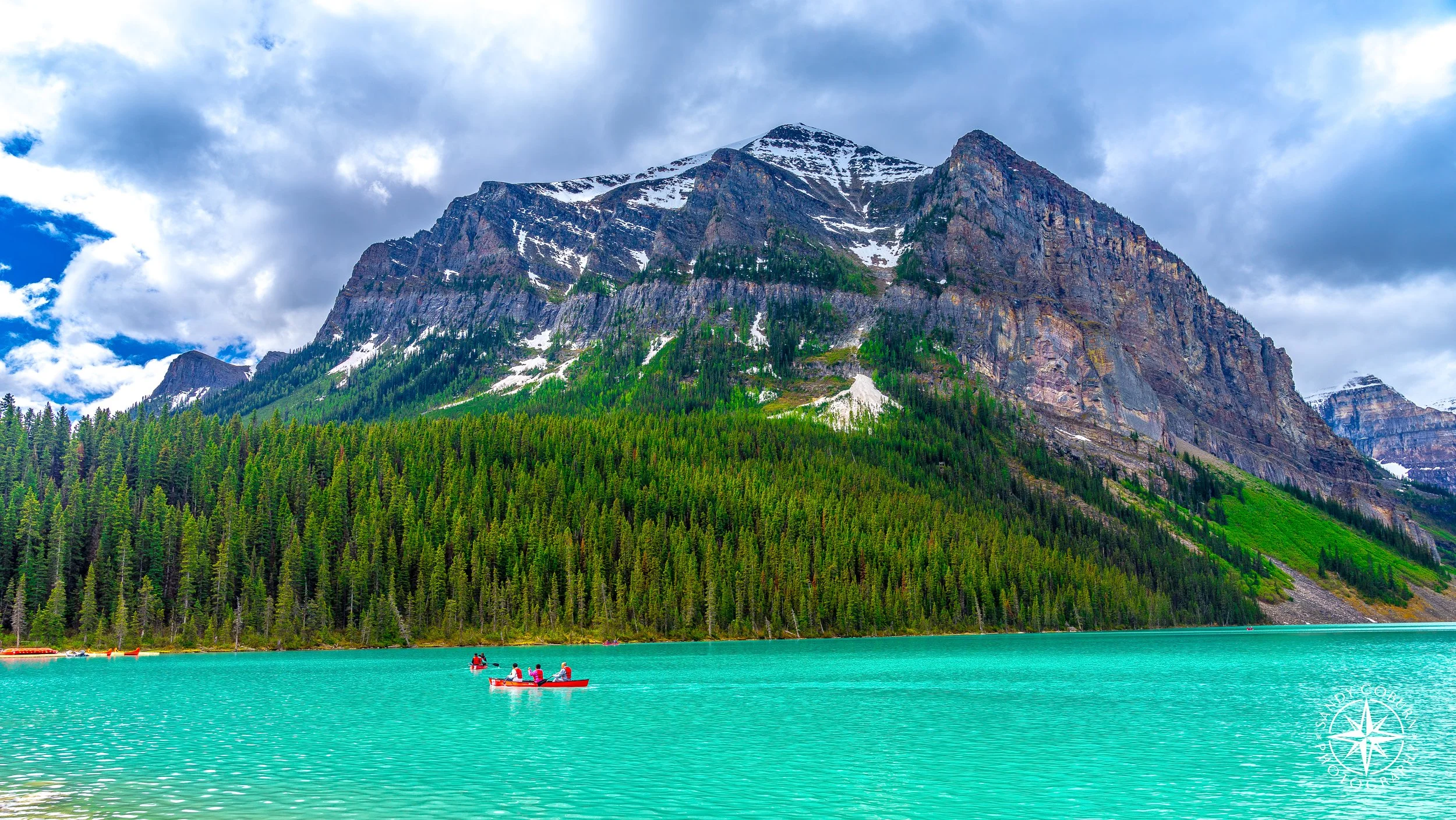 A single red canoe glides across the luminous teal of Lake Louise, its passage gentle beneath towering granite cliffs and shadowed evergreens. Stormy skies linger above, yet the water remains calm—a fleeting moment suspended between motion and stillness.