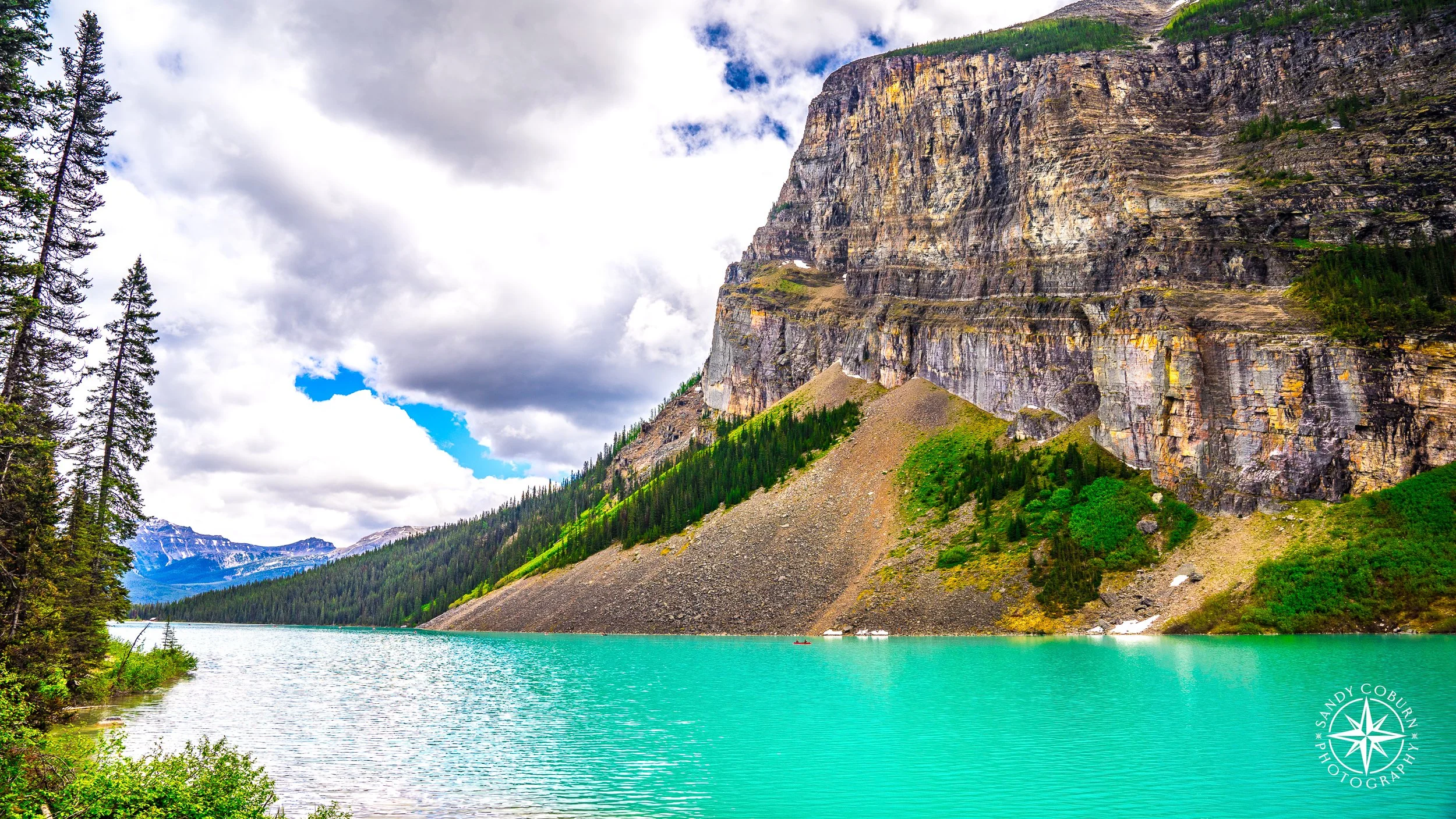 At the foot of a sheer-topped mountain, Lake Louise radiates an otherworldly teal—its glacial waters luminous even beneath cloud-thick skies. The slope gathers the lake’s glow like a vessel, absorbing light and time in equal measure.
