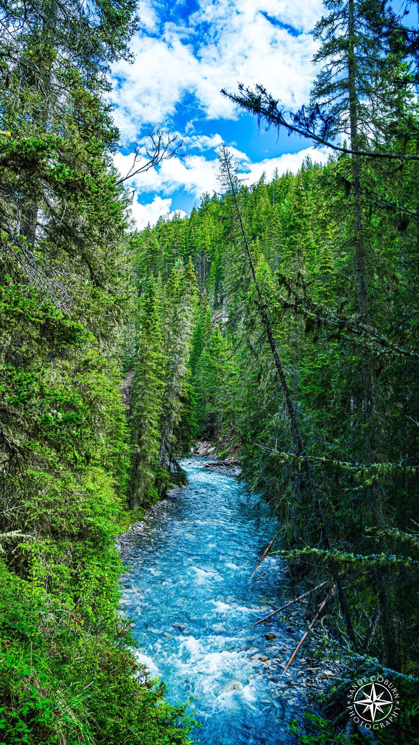 A blue stream winds through the emerald mountains. Framed by glowing evergreens and bright summer skies, the sunlight’s warmth meeting the enduring mountain chill.
