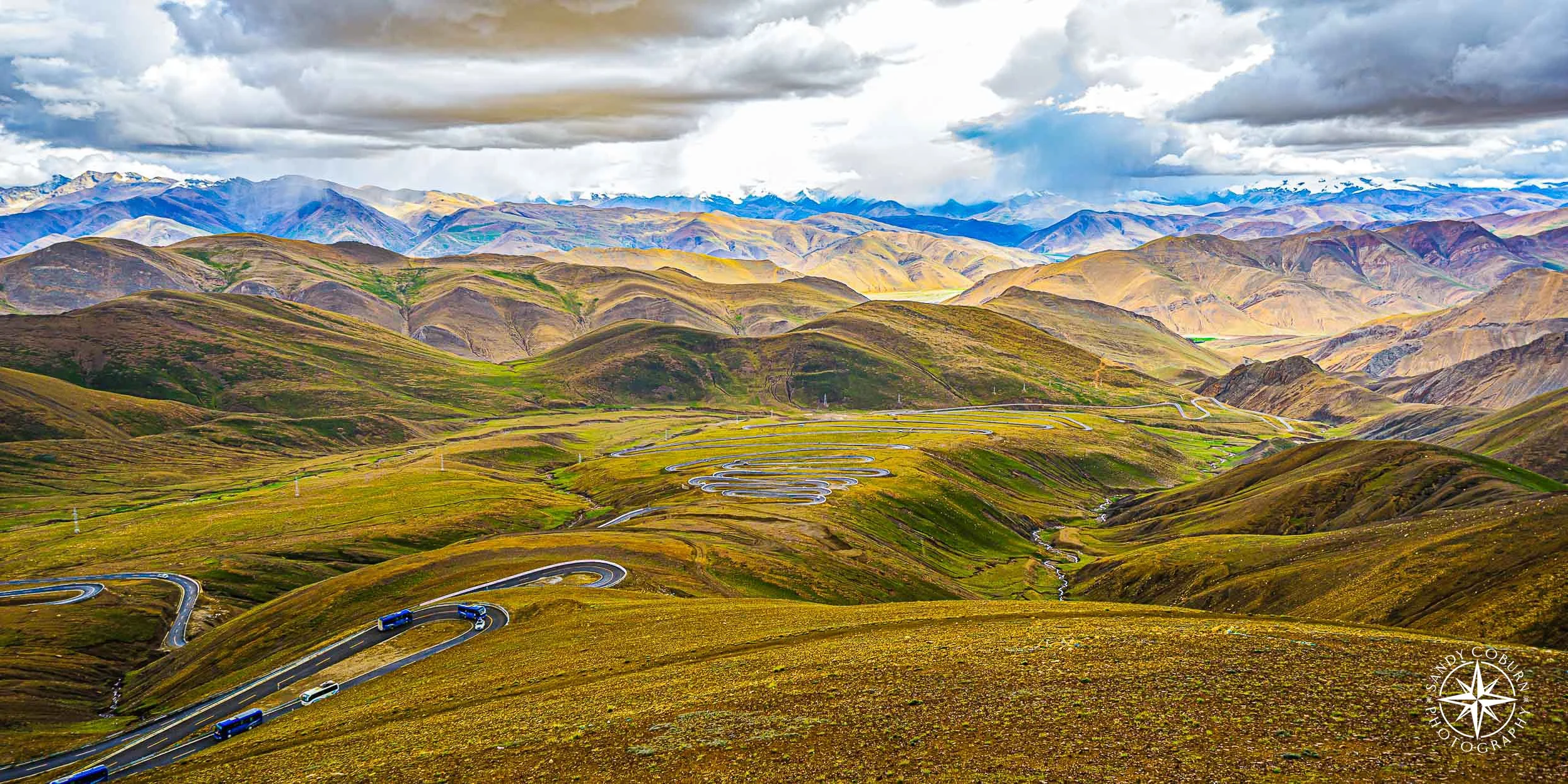 Hairpin turns carve their way up the mustard-colored slopes of the Tibetan Plateau, each curve a defiance of gravity, each rise a gesture toward the distant summit of Mount Everest. Hailed by many as the most beautiful road in the world, this winding path threads through high-altitude winds and golden earth, carrying travelers toward the world's highest peak.