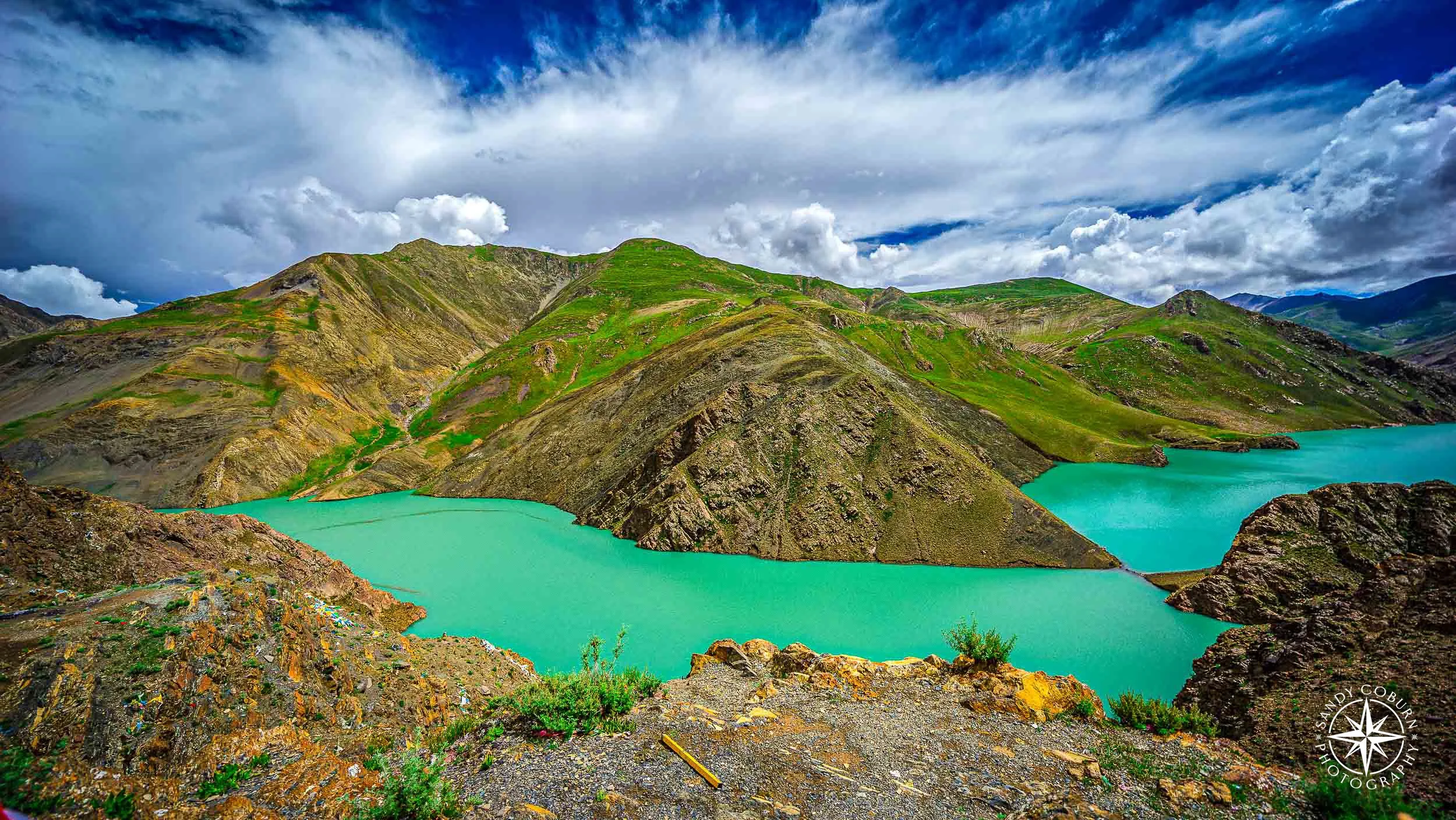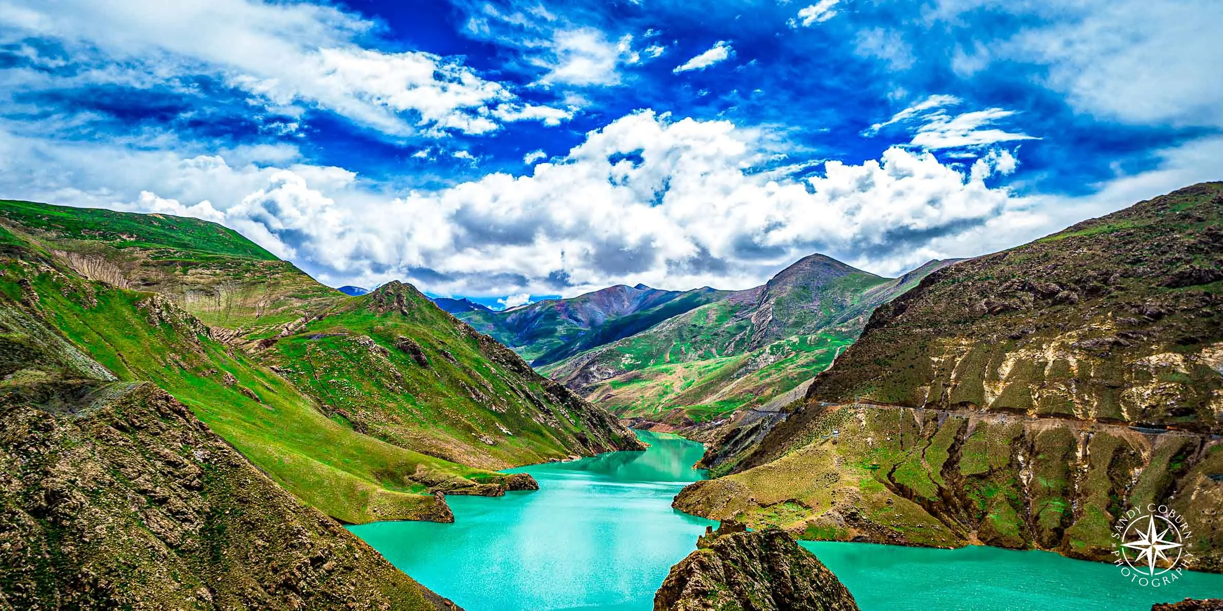 Electric green hills rise beneath a sky scattered with clouds, as the Yarlong Tsangpo River winds quietly below. In this moment, the Himalayas feel like a dream—vivid, impossible, and alive with color and altitude.