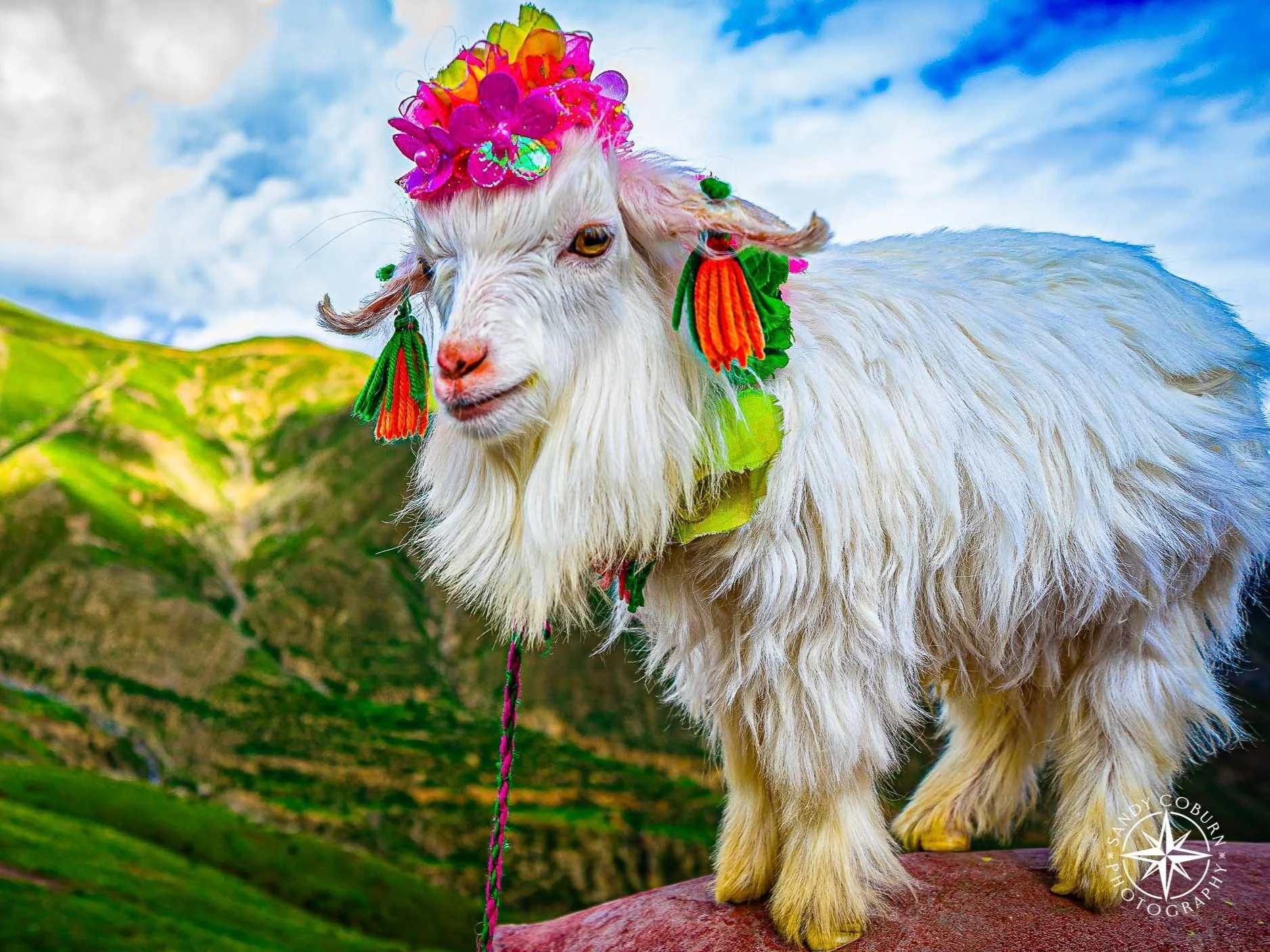 Adorned with blossoms, this young goat poses on a ledge, tender, regal, and beloved. Crowned by both mountain and ritual, they appear a joyful guardian of nature and ceremony, in a world where spirit and land are one.