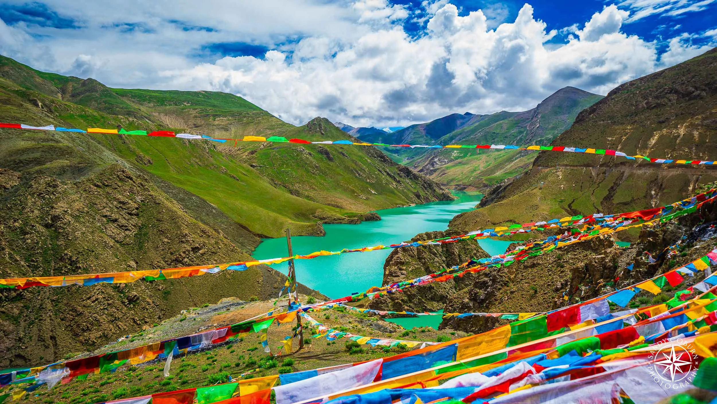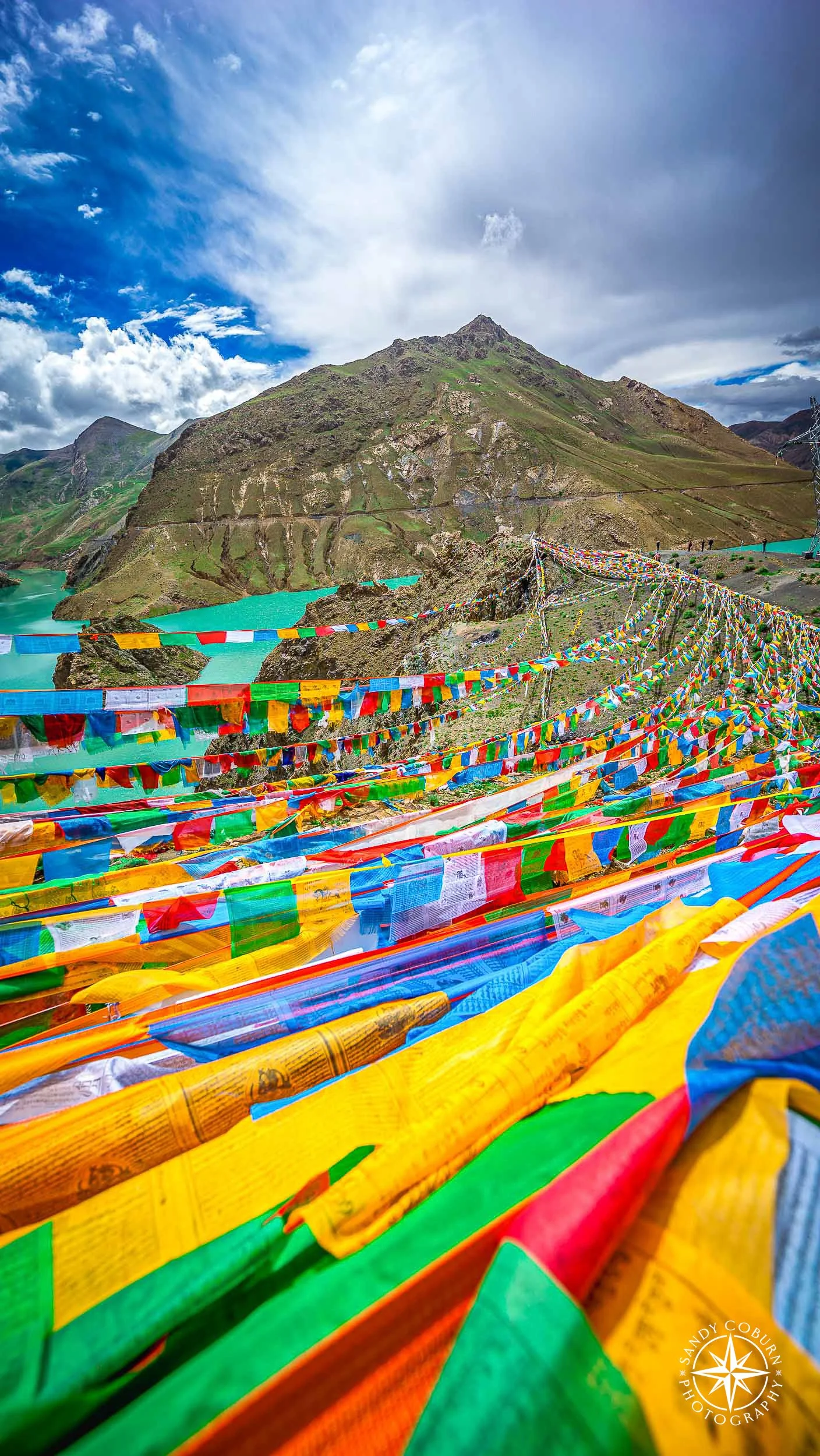 High on the Tibetan Plateau, where the earth brushes the heavens, the landscape quiets the soul. The teal Yarlung Tsangpo River winds its way through the golden and emerald tundra. Roads vanish into the distance. Threads of vivid color stretch across the sky—prayer flags carried by wind, each one an offering to the spirits of air and mountain. These images emerge from the thin air of reverence, where centuries of Buddhist pilgrimage have shaped a terrain that is both vast and intimate.