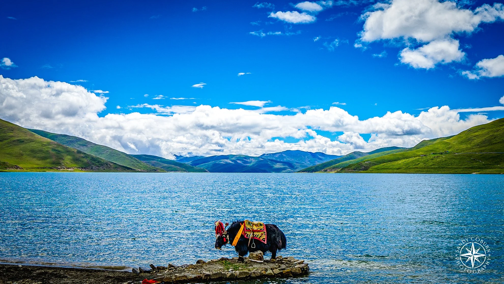 Adorned in vivid ceremonial cloth, a Tibetan water buffalo stands at the water’s edge. In this moment by the Yarlong Tsangpo River.