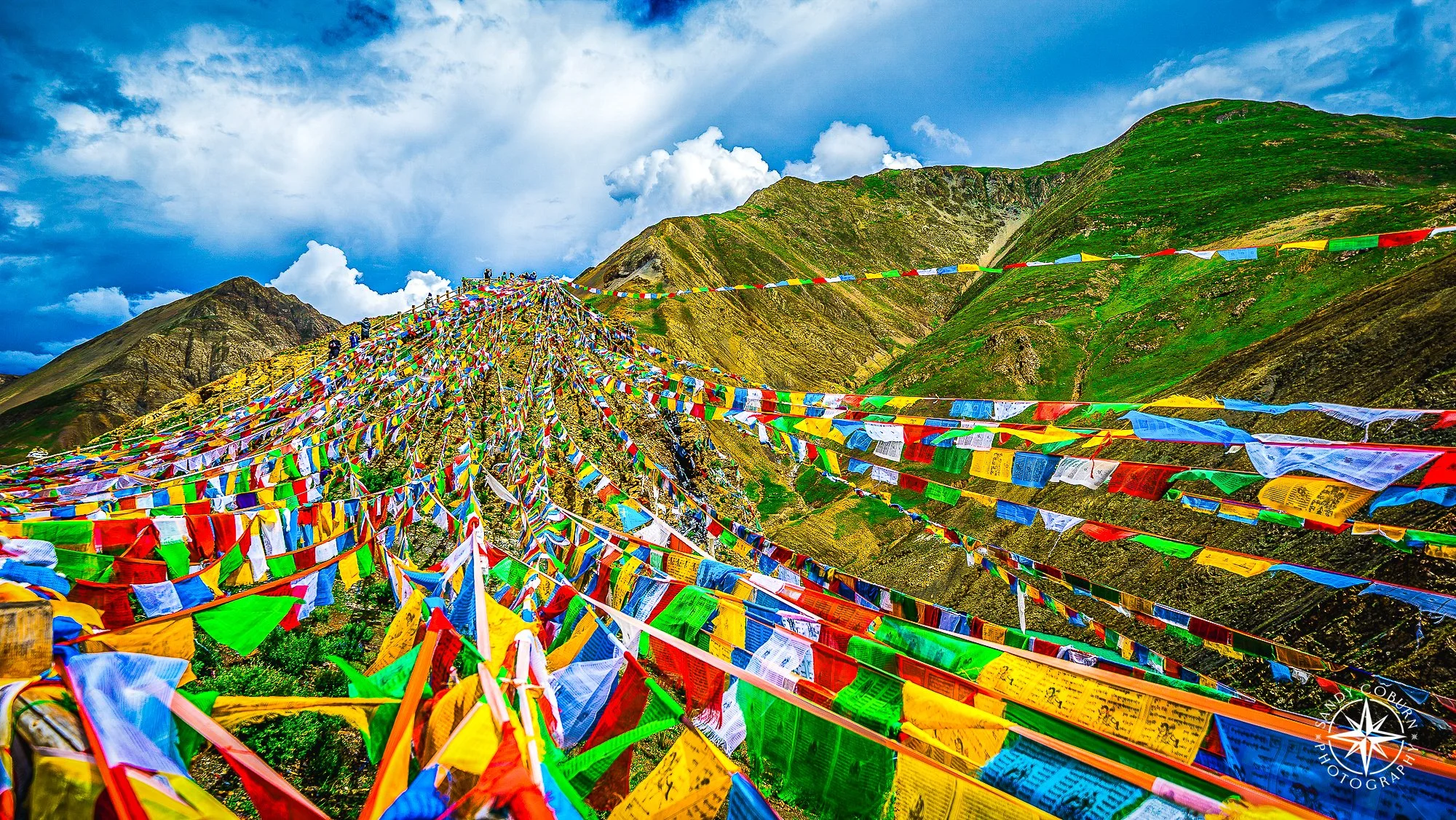 Thousands of prayer flags stretch across the Himalayan ridge, revealing the invisible threads that bind everything together. In this vibrant tangle—color and cloth, sky and stone—connection becomes visible. The flags link past to future, human to earth, silence to presence; the moment feels infinite.